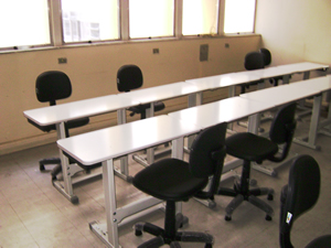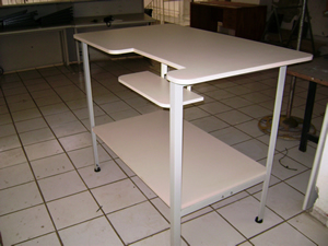 Mesa de trabalho metálica com tampo compensado formicado, fabricado em dimensões e alturas diversas.