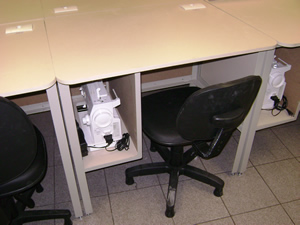 Mesa modular metálica com tampo compensado formicado, fabricado em dimensões e alturas diversas.